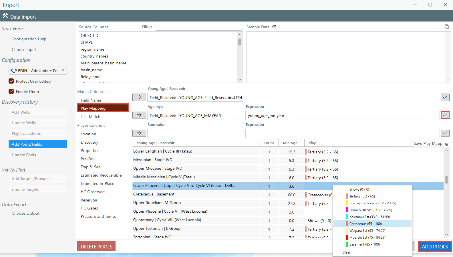 - From the Discovery History select Add Pools/Fields. From the Match Criteria select Play Mapping and select one of the ticks on the right side. This will populate the table with the play definitions from the source data on the left and the Player plays on the right. The table defines how the plays will be mapped when the pools are loaded. Any definitions that are blank, or to change any definitions, right-click in the row on the Play column. Several rows can be defined at the same time by holding the Control or Shift keys when making selections and then choosing a Player play. Select the Add Pools button to load pools.