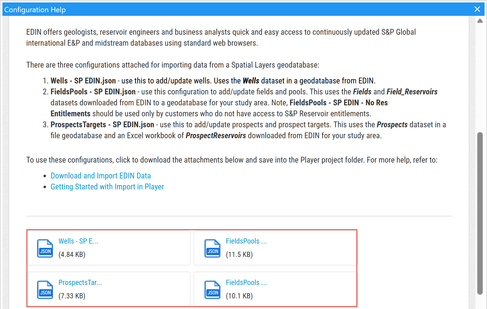 The Player data importer uses configuration files that provide instructions to Player about how to import a dataset. Therefore, configuration files are specific to a dataset. Configuration files for commonly used datasets, such as S&P and WoodMac, have been created and are available for download. To import proprietary datasets contact Player support for help in creating a configuration file.